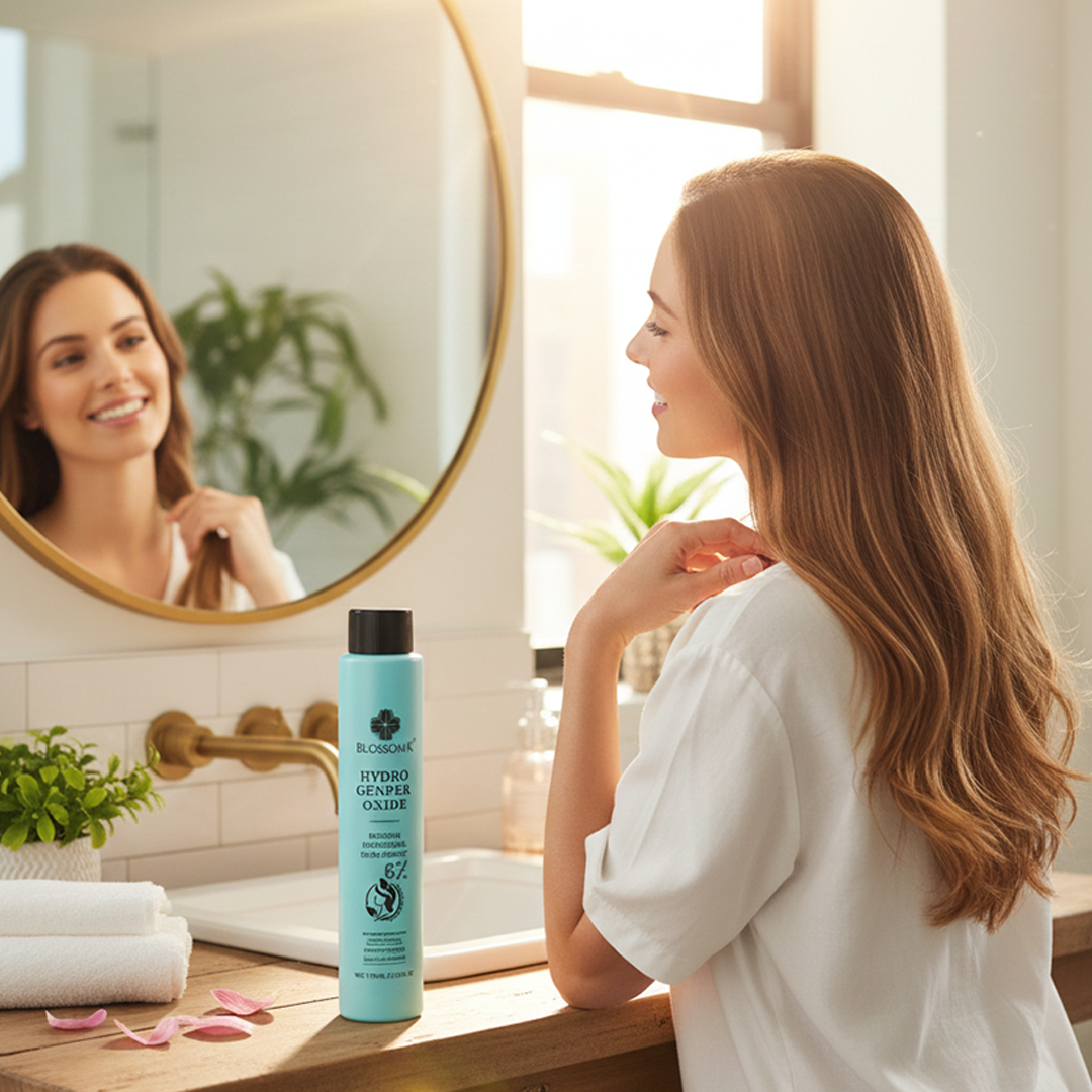 BlossomK Hydro Genper Oxide 6% is a controlled-lift developer formulated for 0–2 levels of lift, root application, grey coverage support, and all standard colour-depositing processes.